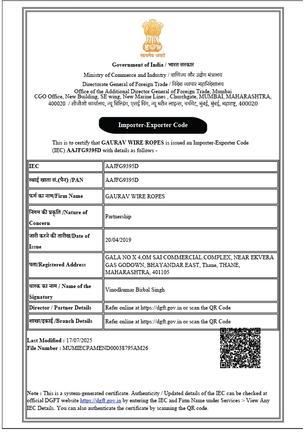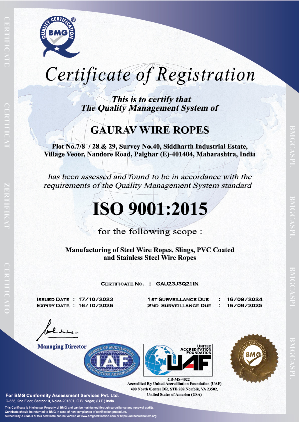At Gaurav Wire Ropes, quality, compliance, and global credibility form the foundation of our manufacturing excellence. Our operations are guided by the ISO 9001:2015 Total Quality Management System, ensuring consistent product reliability, streamlined processes, and continual improvement across all functions. Additionally, our IEC (Import Export Code) Certificate empowers us to seamlessly serve international markets with trusted products that meet global standards. Together, these certifications reflect our commitment to delivering superior wire rope solutions with integrity, precision, and complete customer satisfaction.